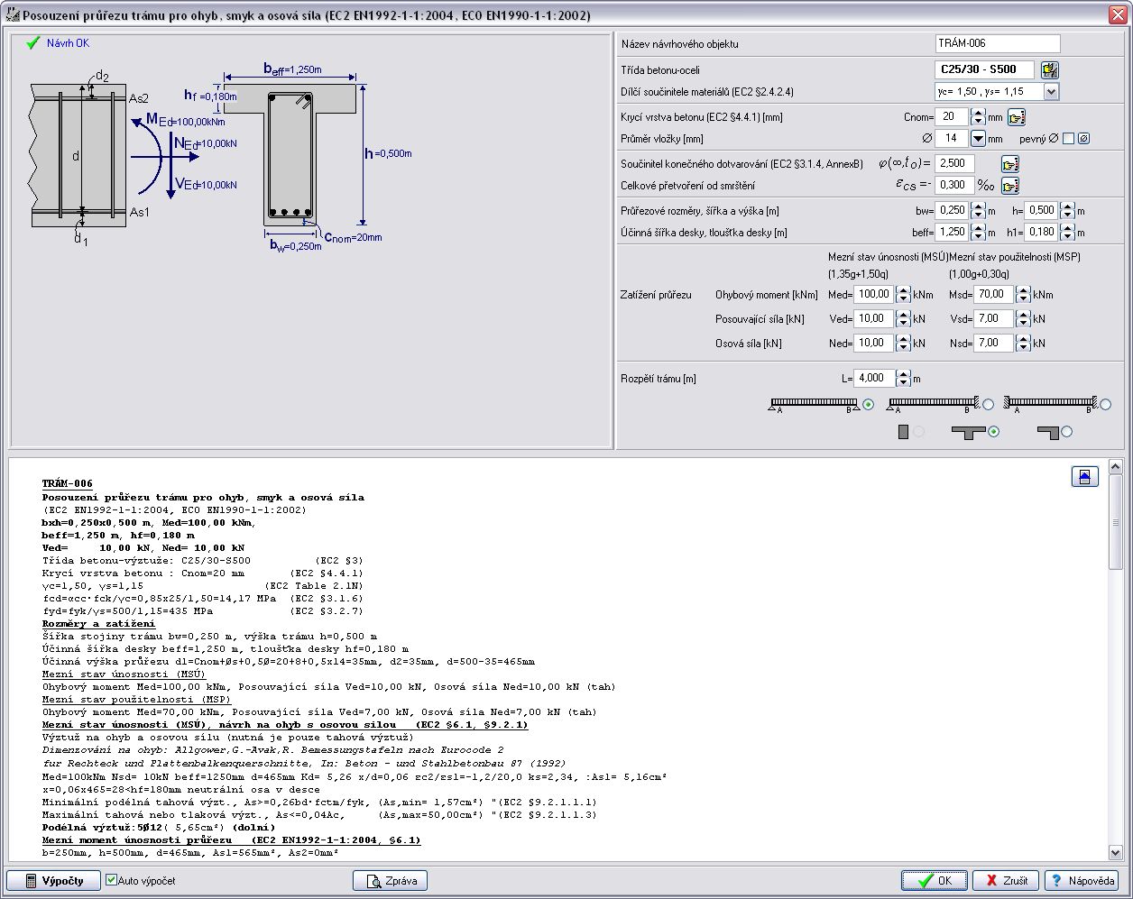 | Trám o jednom poli - zložené zaťaženie | Spojitý trám - rovnomerné zaťaženie | M únosnosti prierezu trámu |